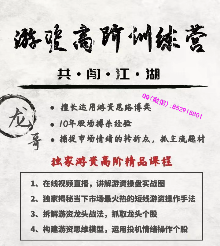 独家游贵高阶精品课程:1、讲解游资操盘实战图2、独家揭秘当下市场最火热的短线游资操作手法3、拆解游资龙头战法,抓取龙头个股4、构建游资思维模型,运用投机情线操作个股课程目录:第一课 赚钱效应系列1、赚钱,就是抓住风口2、什么是赚钱效应3、做短线,只需要快半拍4、牛股诞生的逻辑5、一轮行情的动力:人性逐利6、如何抓抓赚钱效应的拐点7、拐点之后的市场如何演变8、如何判断亏钱效应的拐点