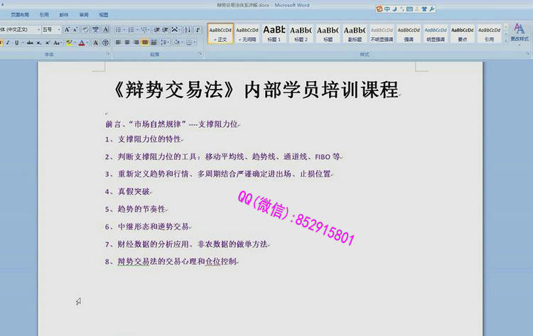 课程大纲:第一课 寻找价格规律与自然规律 Rules of Price and Nature“价格因何涨跌?贪婪和恐惧、群体效应是如何影响市场和交易的?我们面对的是一个完全混沌随机的,还是可以概率化把握的市场?在辨势交易法的课程中,你将了解,“人们的心理预期之和”最终决定了价格水平和方向。人们对价格预期,收到许许多多因素的影响,但在宏观市场中,价格规律和“市场心理”最终却可以留下供我们分析的蛛丝马迹。本课你将对辨势交易法如何用技术分析工具去描述“预期”的,有所感悟和收获。”第二课 寻找精确支撑阻力位 Support and Resistance“在技术分析中,概率和风报比(盈亏比)是最核心的两个要素。在辨势交易理念中,强调的是对高盈亏比果断把握,同时平衡成功率。通过精准合理的分析手段,捕捉到“以小博大”的精确点位。市场中真正完美的点位往往都是转瞬即逝,那么如何通过简单的均线、趋势线、技术指标组合,来去预先捕捉反转点位,是进行辨势交易的基本功,本课你将进一步了解如何使用这些工具来寻找优质点位。”第三课 强度信号 Trading Intensity Signal“高手与普通交易者直接最大的差别,往往不仅是对进场点位的捕捉,对走势强度的判断、出场盈利、止损的把握,才是真正体现交易者水平的关键。如何在小周期上判断价格运行的强度?如何根据强度信号判断合理的出入场位置?这是本节课学习的重点,当你能通过技术分析手段,结合消息面数据,对即将发起的趋势强度有基本准确的判断的时候,你的交易水准将会得到大幅提升。”第四课 进出场规则 Open and Close Rules“不论什么样的交易理论,落实到实际操作中,都是简单的一进一出。一套完整的交易体系,必须包含非常清晰的进出场规则,有了完整的开仓、平仓制度,你将能够在交易中更加果断的执行,摆脱由于贪婪、恐惧等人性弱点导致的失误,保持良好的交易一致性。学习本课中辨势交易的进出场规则,你将在概率上获得真正的博弈优势,为长久的稳定盈利打好坚实的基础。”第五课 最巧妙的逆势交易 Countertrend Trading“正确的逆势交易真的在逆势吗?并不是,对大周期走势的提前预判,结合小周期上的逆势交易踩点,往往是最佳的以小博大的机会;如果能够同时在风险控制上加以完善和约束,那么在任何一年中,你都将有很多获得中长线级别上的、历史性的高低点位。每次成功的Countertrend Trading,都将给你的账户带来大幅的增值。学习如何最巧妙的进行逆势交易,将为你打开财富快速增值的大门。”第六课 交易心理 正确的交易观和金钱观建立正确的交易观、金钱观为什么十分重要?如何摆脱恐惧?如何面对前期的失败?深入探究交易的真像,是助你事半功倍,突破瓶颈的临门一脚,关键一步。视频截图: