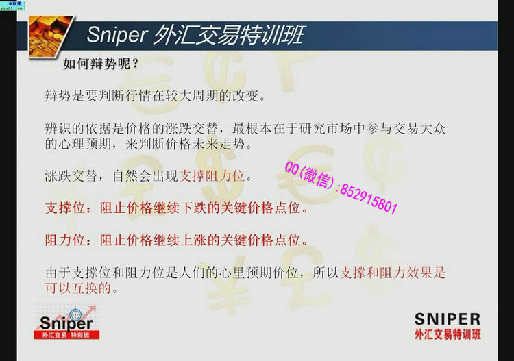 辨势交易法,适用于国内外各类二级市场,课程内分享外汇市场货币交易、现货黄金、国际原油等价格走势的即时解读;盘中交易策略制定及风险、仓位把控;寻找最优介入点,以资参考;强调长期于市场内生存的交易习惯。最新版Sniper《辨势交易法》系统培训课程,完整正式版。经过数年实盘检验的系统交易理论,纠正认知误区,迅速提升实战水平。
