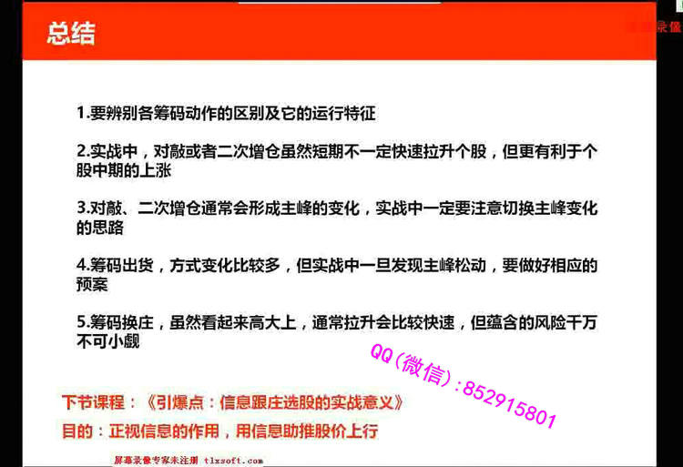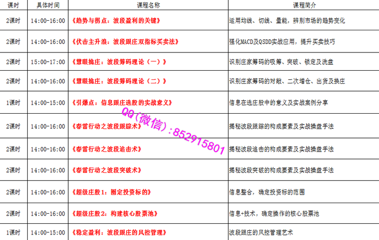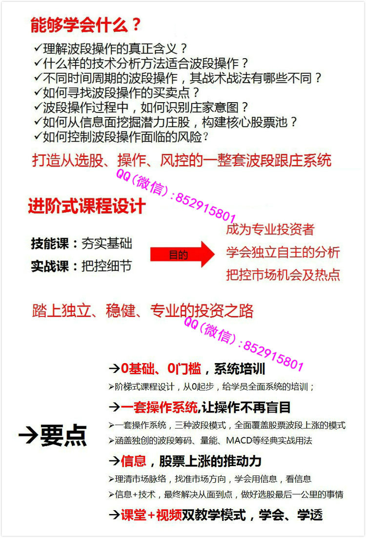 理解波段操作的真正含义什么样的技术分析方法适合波段操作不同时间周期的波段操作,其战术战法有哪些不同?V如何寻找波段操作的买卖点?波段操作过程中,如何识别庄家意图?如何从信息面挖掘潜力庄股,构建核心股票池?r如何控制波段操作面临的风险?打造从选股、操作、风控的一整套波段跟庄系统课程大纲:技能篇:第一课:《趋势与拐点:波段盈利的关键》第二课:《伏击主升浪:波段跟庄双指标买卖法》第三课:《慧眼擒庄:波段筹码理论(一)》第四课:《慧眼擒庄:波段筹码理论(二)》第五课:《引爆点:信息跟庄选股的实战意义》实战篇:第一课:《春雷行动之波段跟踪术》第二课:《春雷行动之波段追击术》第三课:《春雷行动之波段突破术》第四课:《圈定投资标的》第五课:《构建核心股票池》第六课:《稳定盈利:波段跟庄的风控管理》培训视频截图: