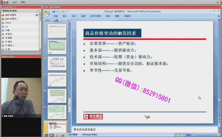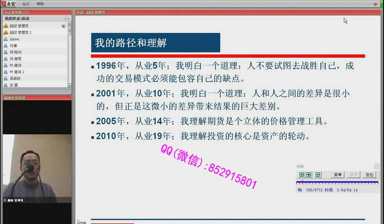 张拥军,92年开始从事期货交易,20余年的投资经历,从商品期货入手逐步拓展到全球商品类的股票和各类金融衍生品。20年一直在磨一剑,从学术、求技、问道到知天命,逐步懂得投资之道人生之理,不求一鸣惊人,但求不断进步,从2002年开始年复合增长在65%以上。 培训视频截图:
