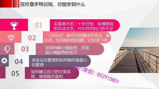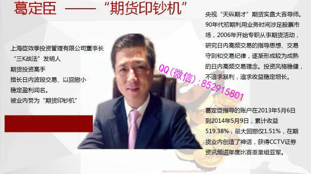 葛定臣指导的账户在2013年5月6日到2014年5月9日,累计收益519.38%,最大回撤仅1.51%,在期货业内创造了神话,获得CCTV证券资讯频道年度比赛重量组亚军。课程安排:第一天 上午9:00-12:001、日内交易的定义、特点和交易的指导思想2、操盘手的基本守则和交易纪律3、开仓守则和失败处理;持仓、止盈、止损守则4、交易计划制定,收盘复盘和交易日志第一天 下午13:30-16:301、行情研判驾驭守则,解密趋势行情日内波动规律2、行情性质判断,审时度势;驾驭行情趋势,踩准行情节奏3、短线、日内交易最佳买卖点4、行情多周期配合使用分析,控制损耗和回撤第二天 上午9:00-12:001、认清行情趋势形式,踩准行情节奏2、完美收益曲线的“三根K线战法盈利模型”3、盈利模型和日内交易的完美结合4、如何判断趋势的持续和反转第二天 下午13:30-16:301、行情趋势形式细分和驾驭,“三个盈利模型”2、上涨趋势形式与盈利模型对接,控制回撤3、横盘振荡与”盈利模型“对接,控制损耗4、下跌趋势形式与“盈利模型”对接,控制反弹5、培养日内稳定盈利的交易习惯,踏上“交易高手”修炼之旅第三天 上午09:00-12:001、"三个盈利模型”在实际操盘中的运用2、K线形态和价格的过滤、排除不影响形态和价格的废K线3、“三根K线模型”定方向在实际操作中的运用原则第三天 下午 13:30—16:301、适合做日内交易的商品选择条件和原则2、研究商品基本面和市场结构、结合形态和价格、把握盈利机会3、研究市场强弱、市场情绪,结合形态和价格拆分对手心态4、比较机会和风险,控制盈亏比,交易心态的培养历程