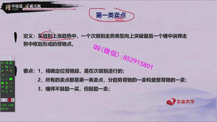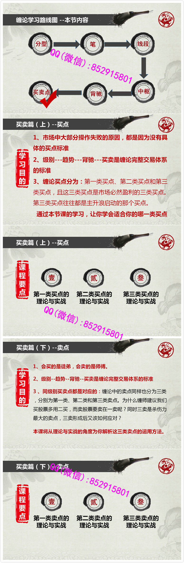 课程大纲:一、买点篇1、市场中大部分操作失败的原因,都是因为没有具体的买点标准2、级别--趋势--背驰--买卖是缠论完整交易体系的标准3、缠论买点分为:第一类买点、第二类买点和第三类买点,且这三类买点是市场必然盈利的三类买点。第三类买点往往都是主升浪启动的那个买点。通过本节课的学习,让你学会适合你的哪一类买点