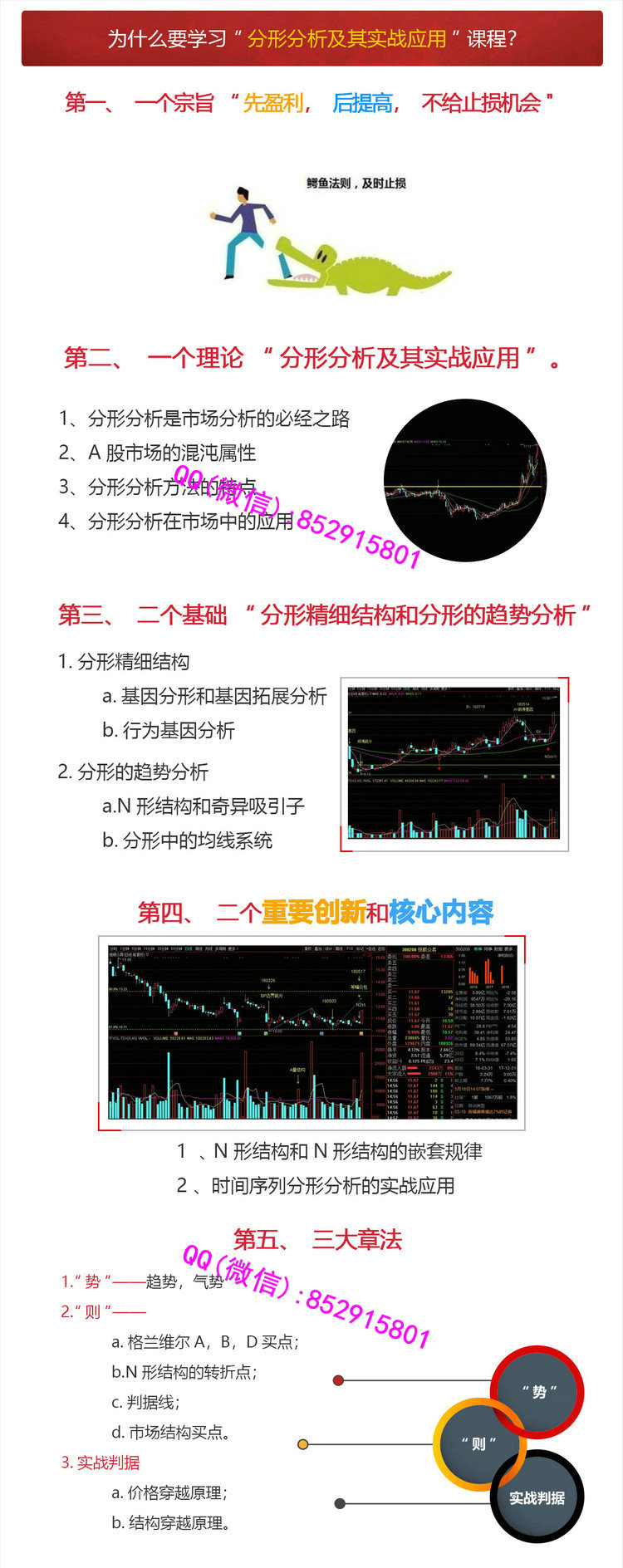 为什么要学习” 分形分析及其实战应用”课程?第一、一个宗旨"先盈利,后提高,不给止损机会(鳄鱼法则,及时止损)第二、一个理论“ 分形分析及其实战应用”。1、分形分析是市场分析的必经之路2、A股市场的混沌属性3、分形分析方法的特点4、分形分析在市场中的应用第三、二个基础“分形精细结构和分形的趋势分析”1.分形精细结构a.基因分形和基因拓展分析b.行为基因分析2.分形的趋势分析a.N形结构和奇异吸引子b.分形中的均线系统第四、二个重要创新和核心内容1、N形结构和N形结构的嵌套规律2、时间序列分形分析的实战应用第五、三大章法1."势”--趋势,气势2."则”-a.格兰维尔A, B, D买点;b.N形结构的转折点;C.判据线;d.市场结构买点。3.实战判据a.价格穿越原理;b.结构穿越原理。视频截图:
