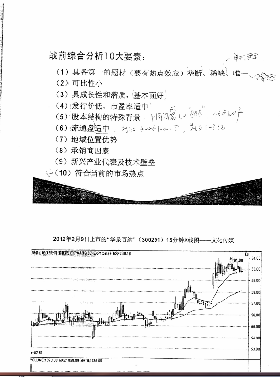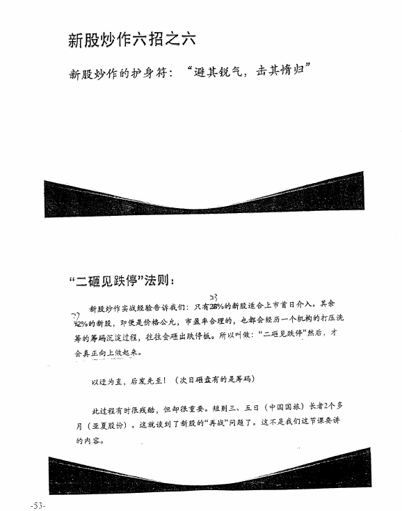 安阳:涵盖了一只新股上市当天值不值得买入、上市后几天内有无好的机会等两类情况。我们了解,判断的标准不应凭感觉,而是一系列标准化的数据。这些“标准”的提出,是我们基于对近千只新股上市首日一系列交易的统计数据所得。如首笔成交占流通盘的比例、前三笔成交的追踪、开盘5分钟的倍量关系、全天换手率、全天震幅等等。要知道,每一个数据背后都有其内在的逻辑联系以及可明说的理由。此法可复制,且通俗易懂,并适合单兵作战,很值得学习。