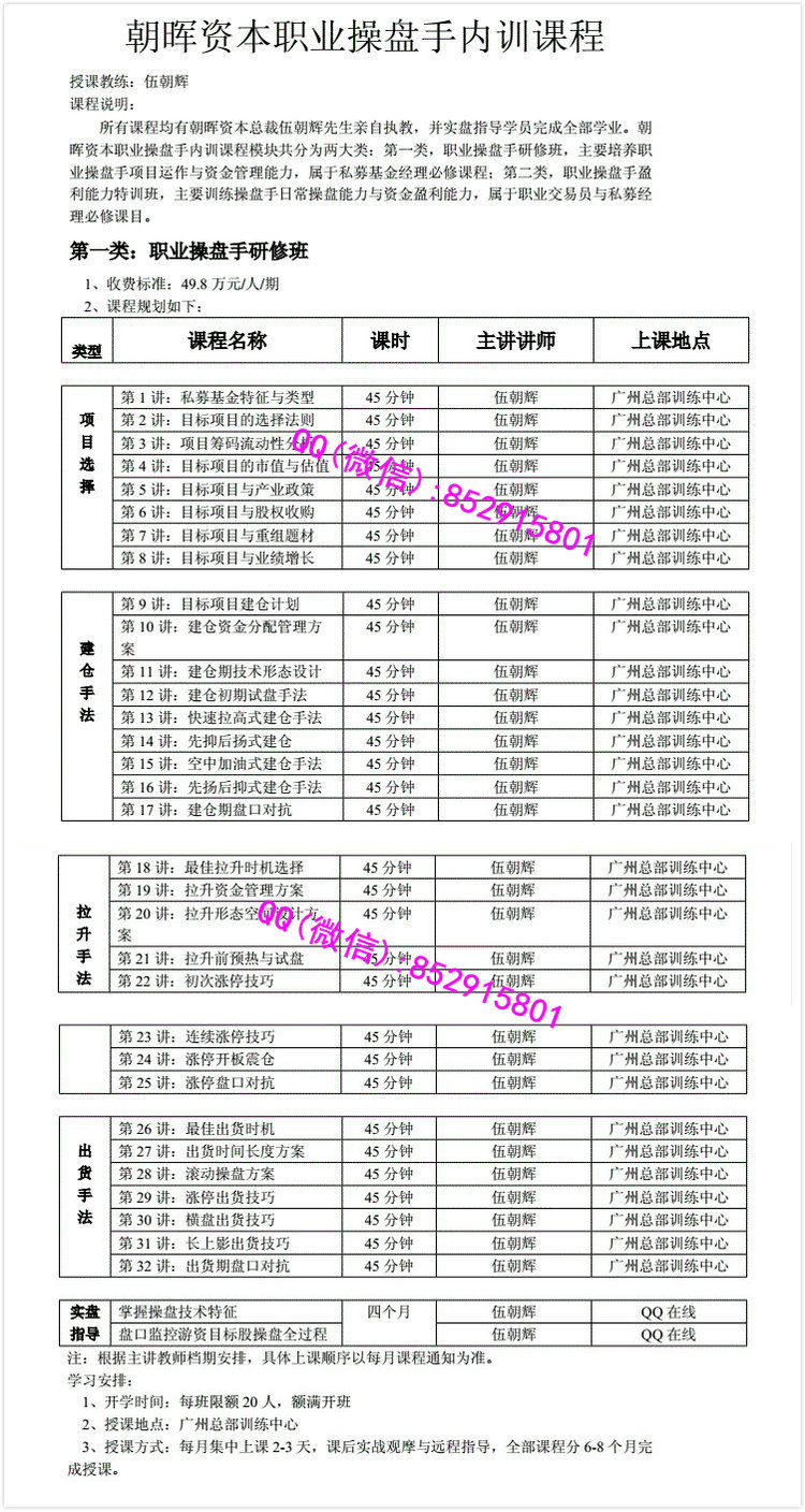 课程说明:所有课程均有朝晖资本总裁伍朝辉先生亲自执教,并实盘指导学员完成全部学业。朝晖资本职业操盘手内调课程模块共分为两大类:第一类,职业操盘手研修班,主要培养职业操盘手项目运作与资金管理能力,属于私募基金经理必修课程:第二类,职业操盘手盈利能力特调班,主要训练操盘手日常操盘能力与资金盈利能力,属于职业交易员与私募经理必修课日。盈利能力特训班,主要训练操盘手日常操盘能力与资金盈利能力,属于职业交易员与私募经理必修课目。对有一定操盘水平的人是最有帮助的,并且说此课程不是万能的,学了此课程也不能让学习者成为亿万富翁!课程的最大价值是揭示了主力运作个股的详细流程和绝大多数投资者不知道的操盘秘密,这些内容是对在股市有操作经验的投资者的操作体系的补漏,市面上是找不到的,也是那些成立公私募基金的基金经理不愿透露的,无奈没有那么多闲余资金就放弃了,太贵了!!本课程属顶级培训,很多基金经理的操盘手法都是出于此。隐于市场,潜心操盘。中国股市狼多,肉也多,但是狼太狡猾了,所以我们要成为猎人!唯有洞悉其操盘规律和手法特点才能成为此。提醒:很多人联系我们,想要购买该课程,价格高,在现在亏损累累、深度套牢的熊市阶段,可能没有那么多的闲余资金购买学习,所以我们商量降低价格,以课交友,多结交一些做过交易员和操盘员的朋友。我们再次声明,该课程不能让您变成“股神”,而且我们也不相信有“股神”的存在!也不能一夜之间让您成为亿万富翁!做投资是一件持久而有乐趣的事情,请仔细品味这句话!不是一蹴而就的,所以需要顺势而为,稳健投资,将风险最小化,我们才能盈利!我们即不夸大也不贬低。该课程的效果,唯有学后自知,请不要相信所谓公众人物的投资建议,他们有的连100股股票都没买过。伍朝辉的操盘手录音文件现堪称珍藏经典版。属于顶级课程,是价值498000元的课程。此录音方便没有机会参加学习的职业炒股人士以及机构操盘手进行系统的学习。原课程培训不是每个人都可以参加培训的,而是有条件的: 1个人股票账户与最近一个月交易交易成绩低的请勿报名咨询。2、个人投资规模低于300万元请勿报名咨询。3、个人投资入市时间低于一年请勿报名咨询。4、通过审核后,方可通知具体报名手续与学习方式。这是一次学费为49.8万的顶级培训,不同于网上流传的那些清华大学操盘手特训课程,那是幼儿园课程,这次的课程属于硕博连读式的顶级课程。在网上很难找到的珍藏版录音文件。