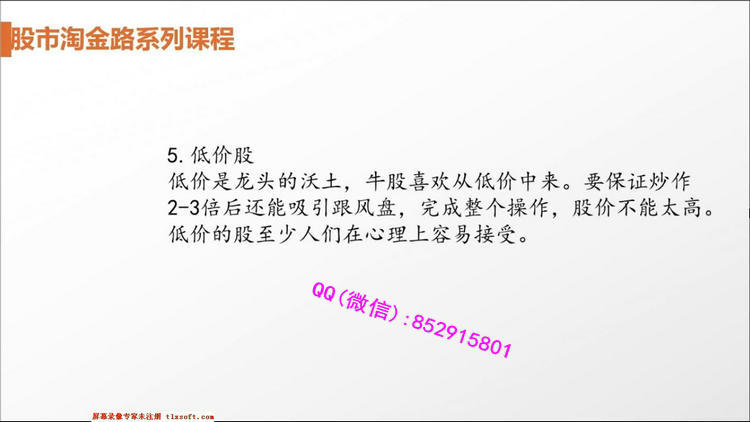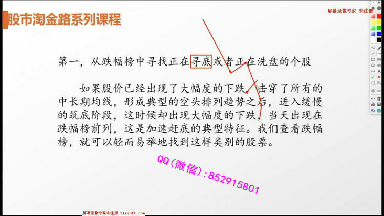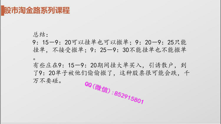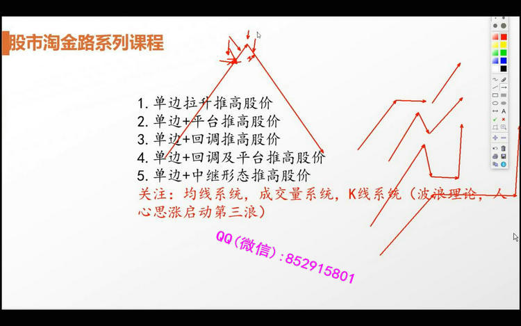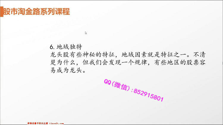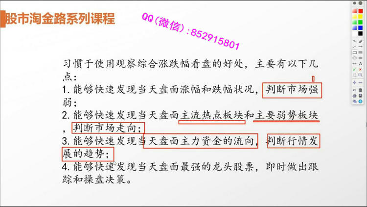 专业领域:心理博弈,资金动向,主力行为。课程目录:一.半小时定乾坤1.股指期货的运用技巧2.集合竞价透视个股走势3.三十分钟定盘技巧4.早盘数据分析5.午盘数据分析6.特殊走势分析二.行情趋势与结构判断技巧1.方向判断-是上还是下2.行情判断-是做还是弃3.速度判断-是快还是慢4.洗盘判断-横盘洗盘、圆弧洗盘还是V形洗盘5.介入点判断-洗盘买还是突破买6.布局判断-炒本身还是炒代表三.市场中的心理博弈1.心理博弈才是市场的王道2.行情特征与机构博弈3.政策面的心理博弈4.技术面的心理博弈5.消息面的心理博弈6.基本面的心理博弈7.资金面的心理博弈四.精耕细作选股法1.涨幅榜选股法2.跌幅榜选股法3.盘中即时选股法4.选股器选股法5.新闻消息选股法6.研究报告选股法五.分级基金与国债逆回购1.分级A与分级B的区别2.分级基金的买卖时机3.国债逆回购的买卖时机4.分级基金与板块的关系5.分级基金与个股的关系6.分级基金面临的风险六.操盘体系与看盘软件结合运用1.重要信息的搜集2.快捷键的使用技巧3.画图工具的使用4.板块的设计技巧5.点系列键的用法6.综合看盘技巧七.股市思维导图1.股市导图导钢2.K线基础3.均线基础4.切线基础5.指标分析6.统计分析7.板块轮动8.股市中的各色骗局八.主力行为盘口解密1.涨停板盘口的奥秘2.低位主力吸筹盘口3.拉升阶段盘口分析4.股票主力洗盘盘口5.打压式盘口分析6.主力减仓和出货盘口7.股票尾盘盘口分析8.盘口细节分析总结九.超短线操作技巧1.短线交易必备的心理2.短线看盘的几个重要时间3.短线交易的买卖点4.识破庄家拉升前操盘手法5.上好T+0的技术课6.股市里境界最高是短线十.题材与热点的操盘技巧1.题材投资中个股的选择2.炒热点的关键思维3.热点的登场方式及操盘方法4.大热点与小热点的不同操作方法5.早盘热点和午盘热点的操盘法6.热点的退潮十一.强势股与龙头股操作技巧1.龙头股的身世之谜2.从技术面寻找谁是龙头股3.龙头股与妖股4.龙头股的切换5.龙头股的介入机会6.龙头股的风险与对策十二.波段操作技巧1.如何抓主升浪的技巧2.波段操作过程中的买入技巧3.波段操作过程中的卖出技巧4.如何根据小时图做波段操作5.炒股吉祥三宝—低价、波段、心态6.波段需要牢记的六大诀窍十三.龙虎榜与强势资金分析1.龙虎榜看成交数据2.资金流分析盘面特征3.主力被套的操作策略4.龙虎榜与强势资金板块分析5.龙虎榜与强势资金个股分析6.交易行为分析十四.股票基本面分析1.基本面分析的价值2.如何判断出股票的成长性3.对宏观的判断4.对行业的判断5.对上市公司自身的判断6.对财务的判断十五.股市风险控制与仓位控制技巧1.如何应对股市潜在的风险2.资金管理与市场行为3.小资金如何运作4.中等资金的实战操作策略5.金字塔式补仓确保资金安全十六.股市投资心法1.股市投资与哲学2.股市投资与佛学3.股市投资与孙子兵法4.股市投资与三十六计5.股市投资与心理学6.股市投资与易经7.股人合一的境界视频截图: