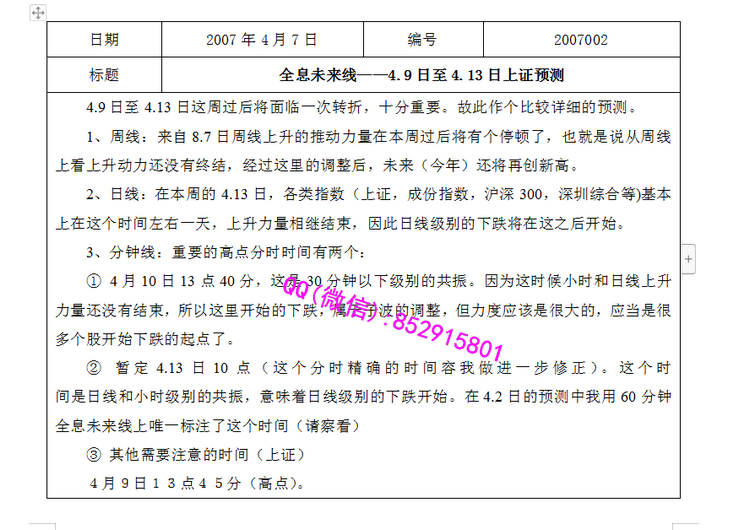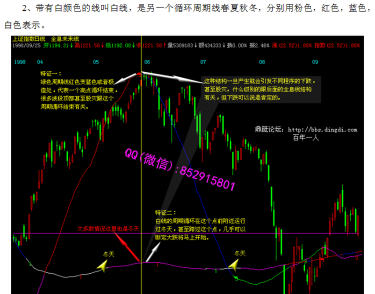 有太多的误区会将你引向歧途。股价按趋势运动,只是粗略地描述了事物的连续性的特征,趋势只是现象不是规律,却被人视为经典,奉为金科玉律;历史往往重复发生,人类会关注只发生过一次的事件吗,重复性是人类所有能认知的事物的共同特征;难道权威们的骰子的随机分布真的能说明人的行为从而证明股票市场是零和游戏吗?我知道骰子决不是人,是时间改变了这一切,今天的你不是昨天的你;缺乏中间概念的理念是空洞的,列宁说:革命怕具体;纪律真的那末有效,能克服人性的贪婪与恐惧吗?别骗自己!要想成功,排除幸运的成分,我们的出路只有一个--最大程度去认知这个市场。预测 是知的最高境界,是科学的最主要的任务之一,在证券市场却常被人贬得一文不值,别忘了,即时的判定,只是此时的信息熵最大,仍是在预测。在艰辛的探索过程中我曾思索过许多哲学问题,因为我知道只有哲学才能帮助我认清事物的本质.我习惯于以万物为师,冥想复杂事物背后简单的道理。达尔文伟大只是将人们司空见惯的简单的“物竞天择,适者生存”的道理系统的做了说明;爱因斯坦天才,因为他相信“上帝不会掷骰子”,相信事物背后的完美与和谐。天空中瞬间闪烁的雷电,永远成之字型,跟股市中的波动遵循同样的原理,人们在猜想什么是江恩的波动法则,波动本身不就是法则吗!我要在沉默中完成所有理想。临别之际,我想送你我认为认识股市10个非常重要的思想,愿能启迪你的智慧。如果你能实事求是,你就应当承认全息未来线挑战了股市不可以精确预测的权威,或许我不能给您带来更多,但我至少给技术分析派带来了希望。让所有一年以来对我功利主义的种种猜疑都烟消云散吧,直到离开,我无所求。1、因果“相同的事务产生相同的事务,相同的原因产生相同的结果”。(江恩语)种瓜得瓜,种豆得豆。邻相生,彼相克。涨是涨的原因,跌是跌的原因。2、循环日出日落,急归所出之处。你可能费尽思量想什么是江恩说的正确的开始,既然循环,现在做为结束不就可以做为开始吗!现在是一面镜子,历史与未来的关系在几何学上是反演与映射的关系。运用循环的思想可以解决非线性系统的预测问题。3、全息一落叶而知秋,一叶一如来。正如dna在生命中的完美,股票市场也存在最微小的元,它会让你发现这种完美,在精确的复制。它存在于涨跌的次序中。海底的贝壳图案与银河系的形状并没有什么不同,这就是宇宙的全息。4、波动波动本身就是法则,波动能耗最小。化学上有能量最低原理,事物运动的方向总是沿着能耗最小的方向运动,同样股市也如此。用能量最低原理,可以证明黄金分割波动能耗最小 事物总是在寻求平衡,消除差别,却永远处于波动的动态平衡之中。5、规律的成因股票市场的游戏规则给系统注入了能量,使其变得有序;大量个体的无序运动会形成整体得上的有序,形成规律。可以类比成物理学上的布朗运动,遵从平均律。也许这让你难以理解,可世界上最难理解的就是这个世界是可以被理解的。6、次序科学从根本上说只研究两个问题数与次序。次序产生美与和谐,美的本质就在于次序。次序的背后是深刻的数和理,承认法则,相信美吧!市场有无形的手。7、共振大小无二。遵循同样的原理,但数量级不同。在股票市场中大周期最终决定了长期走势,波动是各种周期波动叠加的结果,想精确的预测描述市场的运动,要考虑各分钟周期运动对市场的影响,一旦运动方向一致----共振,将产生不以人的意志为转移的拐点。8、时间由于人的记忆遵从遗忘规律,使得越远的事件对现在影响越小,所以在时间上股票市场不应遵循众所周知的简单的黄金分割比率这一发散数列,从现在看历史应当是收敛数列,从现在看未来才是发散的。你还必须注意在《牛顿哲学数学原理》推倒中这样的大量物理事实,如果空间上象人们所看到的遵循黄金分割,那么在时间上必不遵从黄金分割,时间应与一个量扫过的面积成正比。9、结构是次序形成了结构,结构产生了形态。想认知股票市场的本质单从形态,波浪的模式这个视角,层面出发是不够的。用现象的说明现象只能找到必要条件,会陷入反复解释的泥潭,去探究结构背后的原因吧。10、数数是上帝身体的语言。数是最简单的美。智慧有三个源泉,艺术,科学,宗教分别研究的是象数理。去研究一下8卦或者轮中之轮吧,那里有数的答案。差别---能量---运动----信息---次序----结构----形态---涨跌----阴阳,循环往复这是我全部的思想。