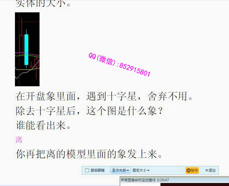 作者研究发明的“哲纳理论”标志着中国东方传统文化思想与现代西方文化的融合和嫁接奠定了坚实的理论基础,填补了现代经济没有东方系统理论得的空白,引起海内外理论界、经济界、思想界和科学界强烈反响并得到广泛好评和应用。一个让中国人感到自豪的经济理论即将传播于世界、造福于人类!课程目录:第一节:象数基本原理(理 象 数)第二节:哲纳K象原理第三节:哲纳象浪原理第四节:小成象浪模型推演第五节:开盘K象原理第六节:开盘K象的应用第七节:象浪基本模型结构原理第八节: 象浪基本模型时间结构原理第九节: 象浪基本模型空间结构原理第十节:象浪基本模型深度解析(复合基本模型)第十一节:象浪基本模型实战运用(75计算公式使用)第十二节:必抓法则(可以抓到的几根K线)第十三节:三角形整理形态第十四节:双底的属性和尖顶尖底第十五节:象浪与波浪第十六节:双顶格局的成败-A第十七节:双顶格局的成败-B第十八节:疯狂的帝震-A第十九节:疯狂的帝震-B第二十节:鱼嘴的绝杀战法-A第二十一节:鱼嘴的绝杀战法-B第二十二节:哲纳实战资金管理方法视频截图: