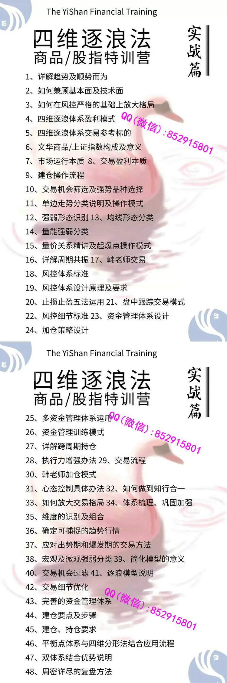 简单易学技术手段和资金管理系统可量化,交易理念和心态控制可质化。学以致用、知行合一变得无比简便。平均每期培训80%以上学员盈利;完全按照导师要求,严格执行平衡点交易体系者,100%盈利;70%以上学员树立起强大信心,在期货市场游刃有余地实现稳定盈利。四维逐浪法(商品/股指特训营)大纲:1、详解趋势及顺势而为2、如何兼顾基本面及技术面3、如何在风控严格的基础上放大格局4、四维逐浪体系盈利模式5、四维逐浪体系交易参考标的6、文华商品/上证指数构成及意义7、市场运行本质8、交易盈利本质9、建仓操作流程10、交易机会筛选及强势品种选择11、单边走势分类说明及操作模式12、强弱形态识别13、均线形态分类14、量能强弱分类15、量价关系精讲及起爆点操作模式16、详解周期共振17、韩老师交易18、风控体系标准19、风控体系设计原理及要求20、止损止盈五法运用21、盘中跟踪交易模式22、风控细节标准23、资金管理体系设计24、加仓策略设计25、多资金管理体系运用26、资金管理训练模式27、详解跨周期持仓28、执行力增强办法29、交易流程30、韩老师加仓模式31、心态控制具体办法32、如何做到知行合一33、如何放大交易格局34、体系梳理、巩固加强35、维度的识别及组合36、确定可捕捉的趋势行情37、应对出势期和爆发期的交易方法38、宏观及微观强弱分类39、简化模型的意义40、交易机会过滤41、逐浪模型说明42、交易细节优化43、完善的资金管理体系44、建仓要点及步骤45、建仓、持仓要求46、平衡点体系与四维分形法结合应用流程47、双体系结合优势说明48、周密详尽的复盘方法讲义截图: