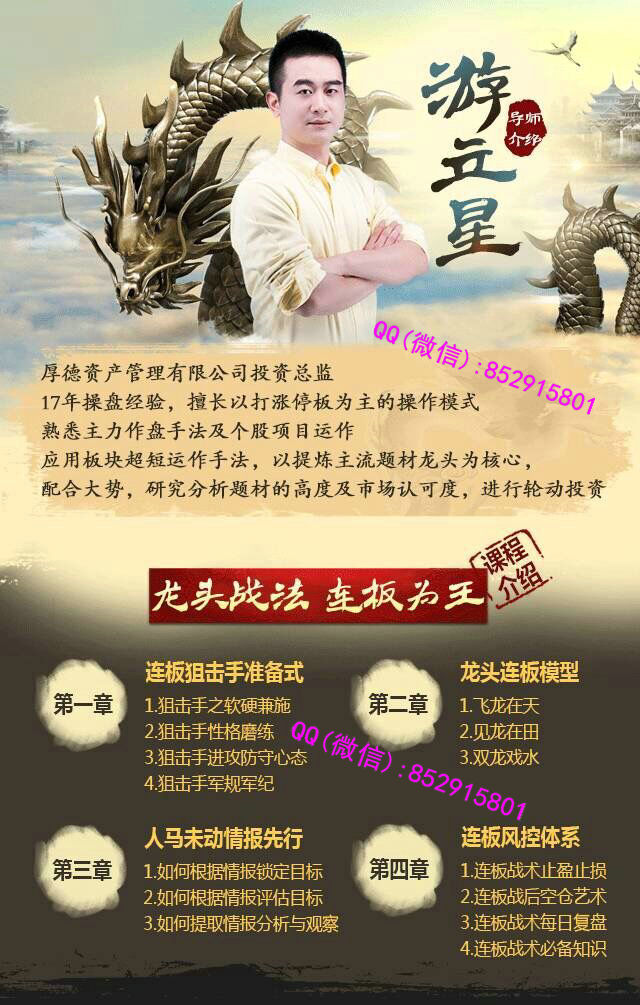 课程纲要:一、连板狙击手准备式1、狙击手之软硬兼施2、狙击手性格磨练3、狙击手进攻防守心态4、狙击手军规军纪二、龙头连板模型1、飞龙在天2、见龙在田3、双龙戏水三、人马未动 情报先行1、如何根据情报锁定目标2、如何根据情报评估目标3、如何提取情报分析与观察四、连板风控体系1、连板战术止盈止损2、连板战后空仓艺术3、连板战术每日复盘4、连板战术必备知识
