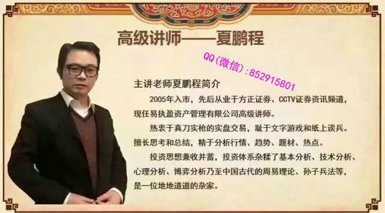 夏鹏程,2005年入市,先后从业于方正证券、CCTV证券资讯频道,现任易执盈资产管理有限公司高级讲师。热衷于真刀实枪的实盘交易,耻于文字游戏和纸上谈兵。擅长思考和总结,精于分析行情、趋势、题材、热点。投资思想兼收井蓄,投资体系杂糅了基本分析、技术分析、心理分析、博弈分析乃至中国古代的周易理论、孙子兵法等,是一位地地道道的杂家。