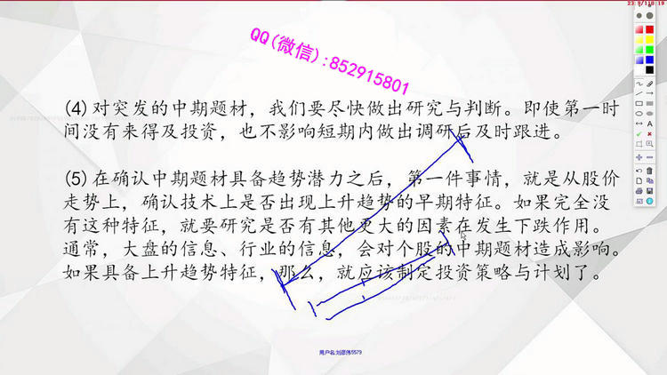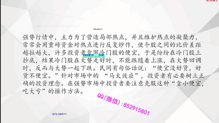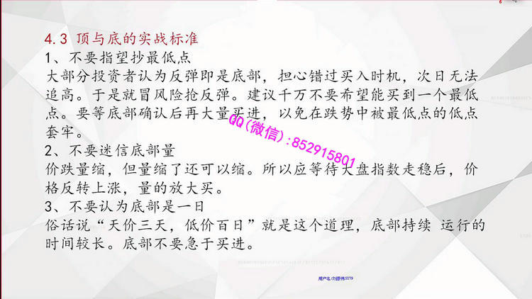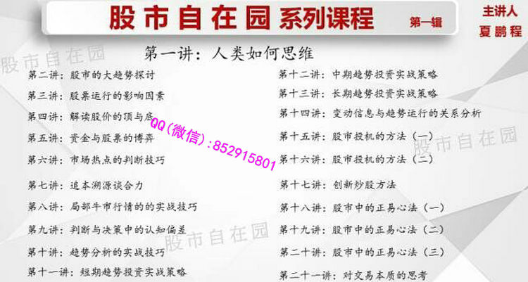 从人类的思维,到趋势的把握。从股市运行的内在逻辑,到顶底的精准把握。从资金的动向把握市场的温度。从合力的理解到对市场的判断与决策。从短期/中期/长期趋势的探讨,掌握在市场中投机与投资的方法。最后从心法的角度引发对交易本质的思考。课程目录:第一讲:人类如何思维第二讲:股市的大趋势探讨第三讲:股票运行的影响因素第四讲:解读股价的顶与底第五讲:资金与股票的博弈第六讲:市场热点的判断技巧第七讲:追本溯源谈合力第八讲:局部牛市行情的的实战技巧第九讲:判断与决策中的认知偏差第十讲:趋势分析的实战技巧股市第十一讲:短期趋势投资实战策略第十二讲:中期趋势投资实战策略第十三讲:长期趋势投资实战策略第十四讲:变动信息与趋势运行的关系分析第十五讲:股市投机的方法(一)第十六讲:股市投机的方法(二)第十七讲:创新炒股方法第十八讲:股市中的正易心法(一)第十九讲:股市中的正易心法(二)第二十讲:股市中的正易心法(三)第二十一讲:对交易本质的思考培训视频截图: