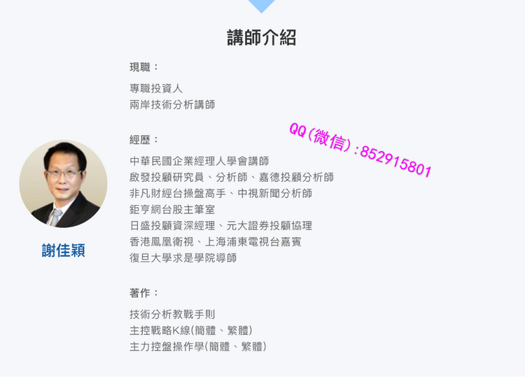 谢佳颖,专业投资30年,培训经验25年,造就两岸无数投顾分析师,机构操盘人,私募基金操盘手,及技术分析讲师…等。