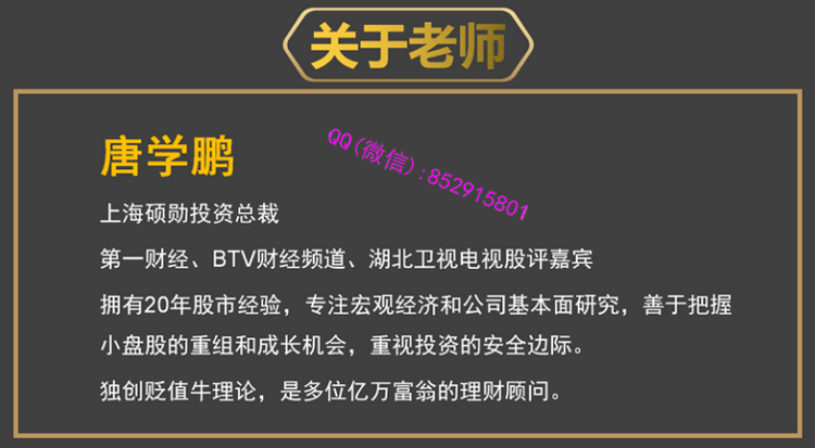 唐学鹏,上海硕勋投资总裁。第一财经、BTV财经频道、湖北卫视电视股评嘉宾。拥有20年股市经验,专注宏观经济和公司基本面研究,善于把握小盘股的重组和成长机会,重视投资的安全边际。独创贬值牛理论,是多位亿万富翁的理财顾问。