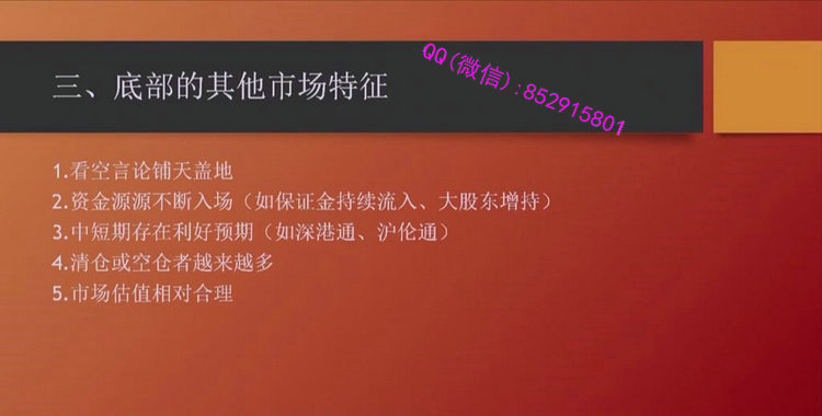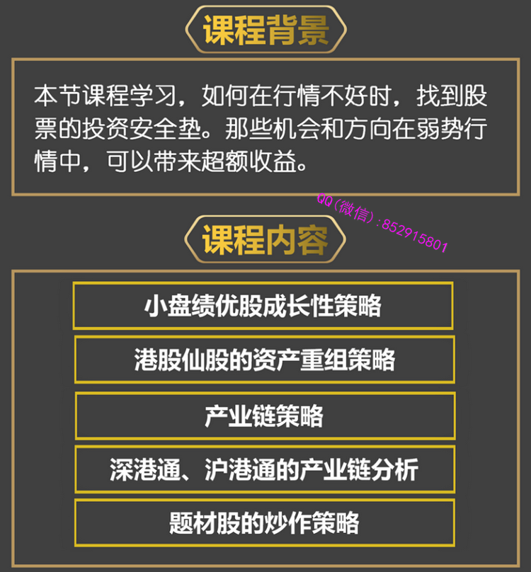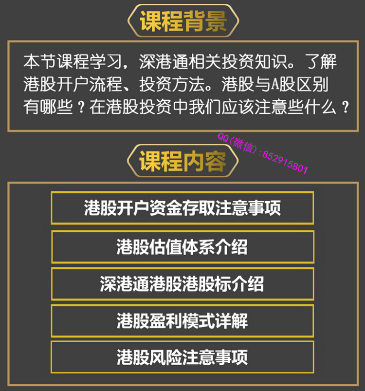 课程大纲:一、课程背景本节课程学习,深港通相关投资知识。了 解港股开户流程、投资方法。港股与A股区别有哪些?在港股投资中我们应该注意些什么?课程内容:港股开户资金存取注意事项口港股估值体系介绍深港通港股港股标介绍港股盈利模式详解港股风险注意事项二、课程背景本节课程学习,如何在行情不好时,找到股票的投资安全垫。那些机会和方向在弱势行情中,可以带来超额收益。课程内容:小盘绩优股成长性策略港股仙股的资产重组策略产业链策略深港通、沪港通的产业链分析题材股的炒作策略三、课程背景本节课程学习,顶底如何提前判断?底部的形成过程是什么样的?需要哪些特征才能够确定底部?哪些情况出现是顶部形成的信号?本节课程详细为你讲解。课程内容:底部的形成要点底部的其他市场特征高位巨量巨阴成顶破上升趋势线成顶顶部其他特征