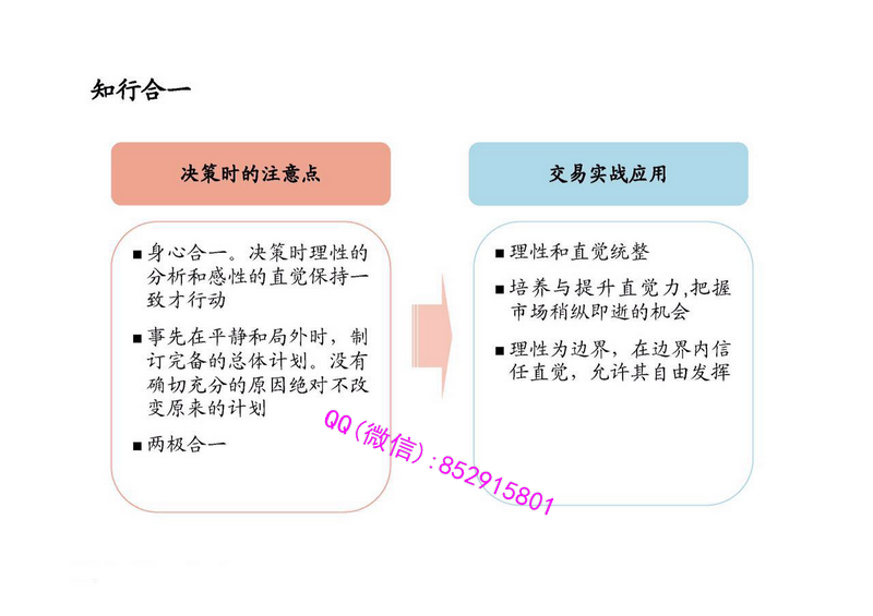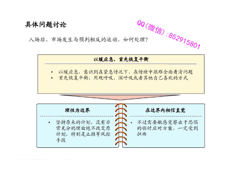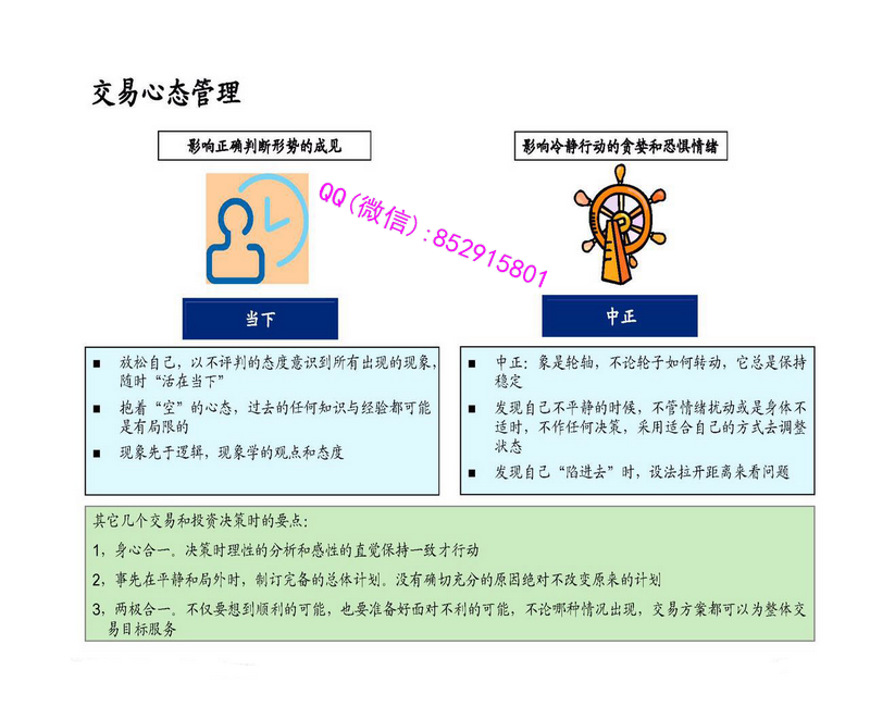 课程目标:通过课程讲解及各种练习,帮助学员体会“禅”的状态,从而在实践中培养良好的状态,在已掌握的理论和知识的基础上,建立进入良好状态的实用“开关”机制,在实践中革命性提高交易水平。适合对象:对交易基本理论和技巧已经有比较全面的知识,有一定实战经验,希望在已有基础上突破瓶颈、迅速提升盈利能力的投资者。课程议题:除了简单介绍“禅”的基本知识、历史和背景,本课程着重探讨以下问题:看清现实:体验“活在当下”的状态,随时看清外在形势的变化,克服成见和个人主观愿望选择性注意的干扰。无意识会引导我们看到自己构建的世界,而非真实的世界。金融市场里影响资产价格的因素众多,只有如实如是全面看清市场,才能获得较好的交易成果。情绪管理:人们常说,驱动金融市场的是贪婪和恐惧,通过本课程修炼“中正”的状态,调整和控制心态,面对自己的贪欲和恐惧,保持决策时的平衡心态。根据每个个人的具体情况,帮助每个人建立一套在情绪扰动情况下调整自我的策略,在心态失衡时,迅速意识到并及时进行调整。决策能力提高:统整理性和直觉,提高决策能力。理性的特点是系统性,但是耗时耗资源较多;直觉的特点是实时性,但是缺少严谨的结构。在现实的交易决策中,如何有机地结合这两者是至关重要的。仅依靠理性或仅依靠直觉有时都可能是危险的。本课程指导学员培养与提高直觉力,与理性的知识体系相结合,帮助每位学员练就自己的绝招。具体课程大纲如下:第一课:《禅的介绍》禅的定义,意识和无意识什么是“觉察”(“觉”)行为金融学与禅禅和金融概述:当下、中正和决策交易实战应用介绍觉察练习入门第二课:《看清当下》历史上经典案例念头和欲望的干扰过去现在和未来的关系,选择性注意感知真实和虚假市场信号敏感把握市场的变化,抓住拐点当下练习第三课:《中正:管理情绪》情绪的生理心理学意义情绪对金融市场和从业人员的影响中正的价值和意义止损的实践和要领从情绪中迅速恢复平衡的具体窍门在逆境中,如何消除噪音,做好风控的同时如何坚持下去中正练习第四课:《决策能力提高》理性和直觉统整培养与提升直觉力,把握市场稍纵即逝的机会实际操作:基本面、技术面和情绪面的综合决策练习:脑和腹的力量,理性和直觉的关系讲义截图: