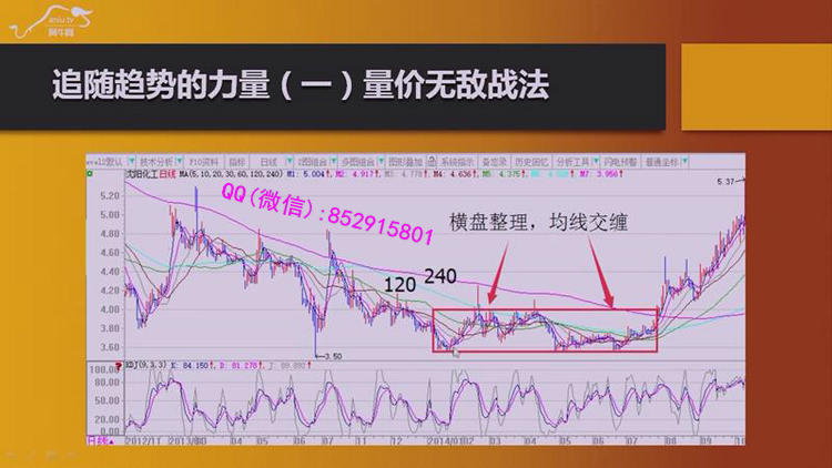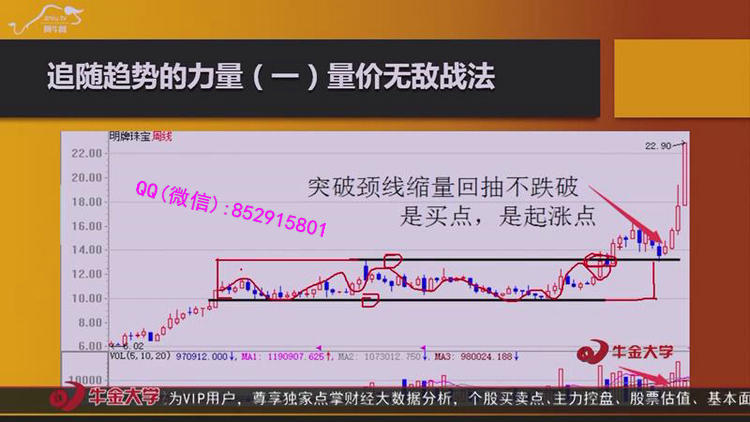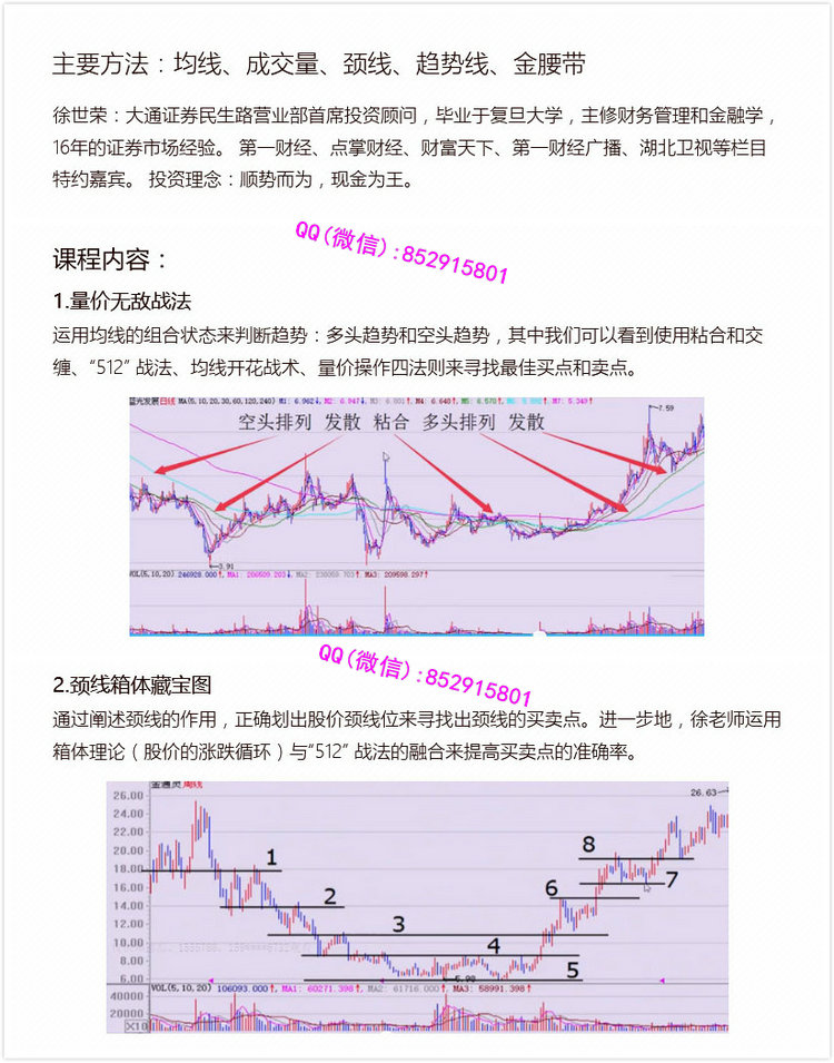 课程内容:1.量价无敌战法运用均线的组合状态来判断趋势:多头趋势和空头趋势,其中我们可以看到使用粘合和交缠、“512"战法、均线开花战术、量价操作四法则来寻找最佳买点和卖点。