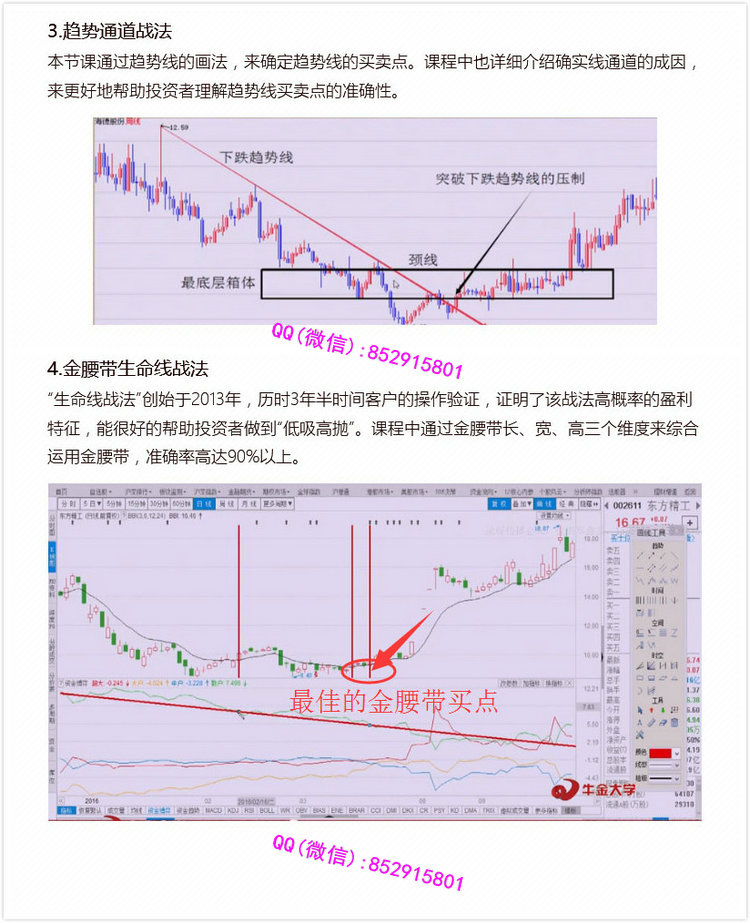 3.趋势通道战法通过趋势线的画法,来确定趋势线的买卖点。课程中也详细了绍确实线通道的成因,来更好地帮助投资者理解趋势线买卖点的准确性。