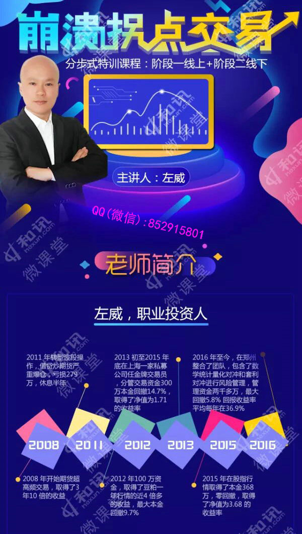 左威,职业期货短线操盘手,有8年期货实盘经验,擅长短线和中短线的波段交易。2012年至今左威老师连续4年保持净值收益238%以上。在2015年的股指期货行情中,368万资金做到了1279万,净值收益率达到了348%,最大回撤仅为为12%。实现了4年10倍盈利的优秀成绩,实盘水准经受过实盘秀的验证和锤炼,实盘业绩有目共睹。左老师作为和讯网旗下实盘秀节目的主力讲师,本着授人以鱼不如授人以渔的理念,希望将自己的操盘理念以及对期货品种中短线节奏和势的把握,传授给学员,帮助大家早日成为赚钱高手!