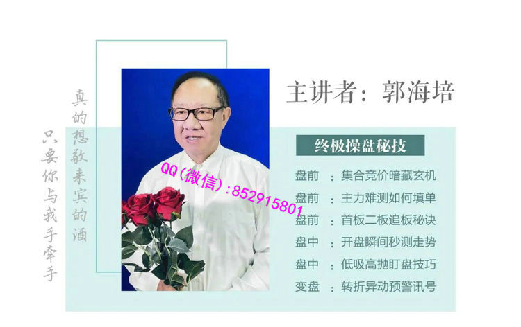 郭海培,台湾股市第一人,台湾第一家报纸证券版的创办人、台湾第一家证券专业报纸总编辑、台湾第一家投顾(财星)总经理、台湾第一家专业证券周刊(财星)总编辑、台湾第一个上电子媒体的证券分析师。台湾所有电视新闻台、财经台主讲嘉宾,香港凤凰卫视台场外联线财经评论嘉宾。股市常青树,桃李满天下。曾培训出台湾绝大多数知名证券分析师、财经评论员,被同行敬称为“郭班长”, 全方位分析师,帮你抄底逃顶做主升段,专注抢短、预测趋势,顺大势,赚行情。