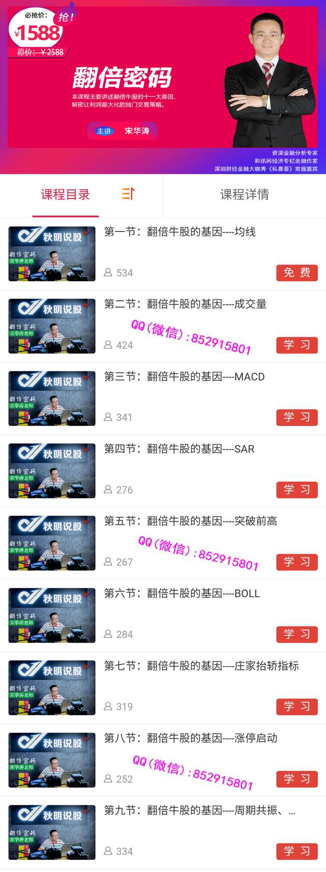 宋华涛,资深金融分析专家。和讯网经济专栏金融作家,深圳财经金融大咖秀《私募荟》常座嘉宾。 课程目录: 第一节:翻倍牛股的基因--均线 第二节:翻倍牛股的基因--成交量 第三节:翻倍牛股的基因--MACD 第四节:翻倍牛股的基因--SAR 第五节:翻倍牛股的基因--突破前高 第六节:翻倍牛股的基因--BOLL 第七节:翻倍牛股的基因--庄家抬轿指标 第八节:翻倍牛股的基因--涨停启动 第九节:翻倍牛股的基因--周期共振、热点、龙头 视频截图: