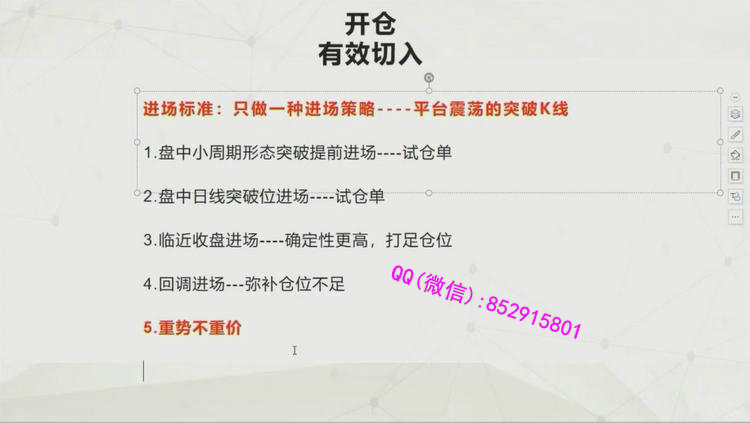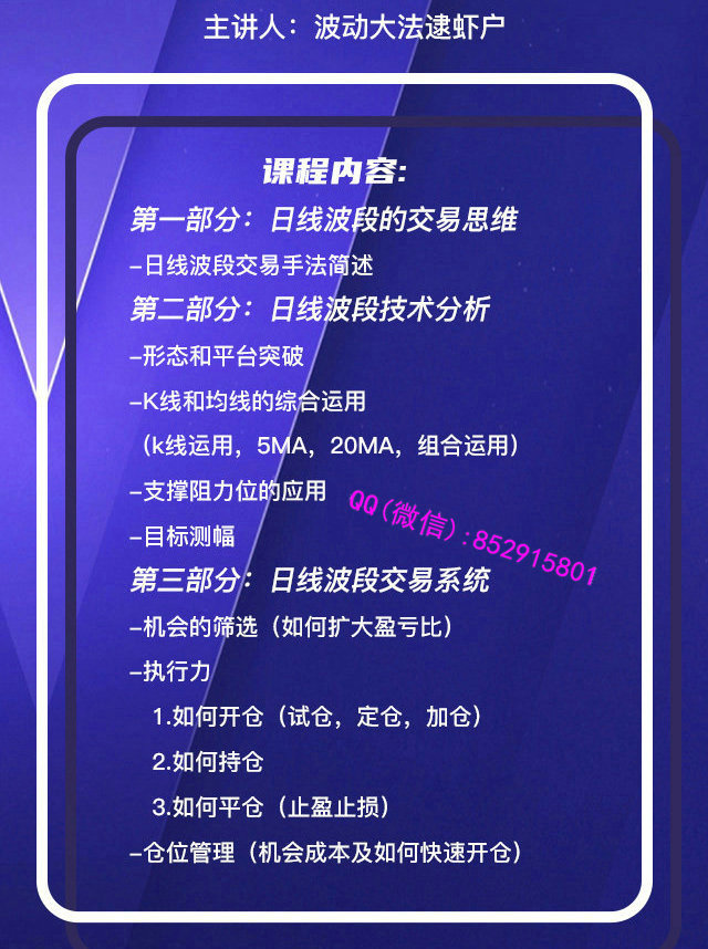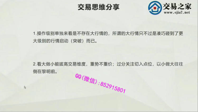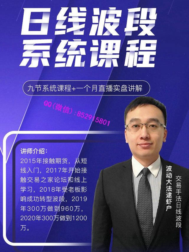 2015年接触期货,从短线入门,2017年开始接触交易之家论坛和线上学习,2018年受老板影响成功转型波段,2019年300万做到960万,2020年300方做到1200万。课程内容:第一部分:日线波段的交易思维-日线波段交易手法简述第二部分:日线波段技术分析-形态和平台突破- K线和均线的综合运用(k线运用,5MA, 20MA, 组合运用) -支撑阻力位的应用-目标测幅第三部分日线波段交易系统-机会的筛选(如何扩大盈亏比)-执行力1.如何开仓(试仓, 定仓,加仓)2.如何持仓3.如何平仓(止盈止损)-仓位管理(机会成本及如何快速开仓)赠送直播+复盘视频截图: