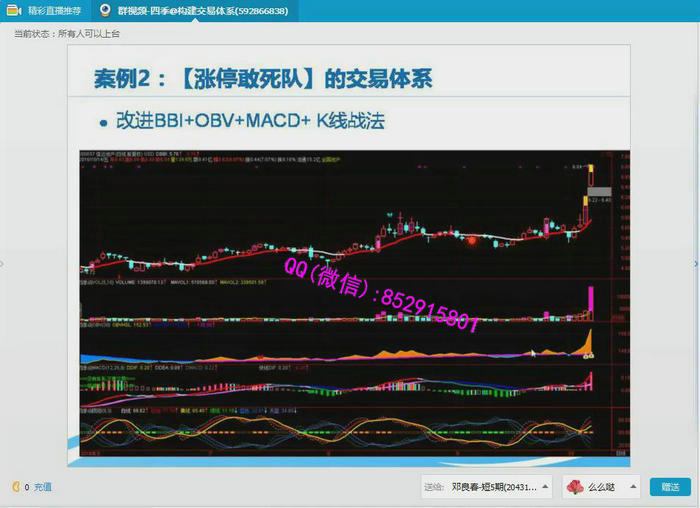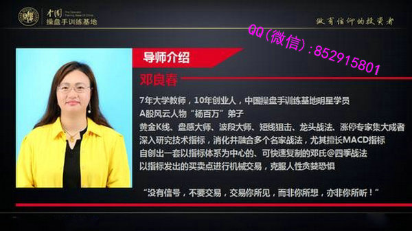 邓良春一7年大学教师,10年创业人,中国操盘手训练基地导师 A股风云人物“杨百万”弟子 黄金K线、盘感大师、波段大师、短线狙击、龙头战法,涨停专家集大成者深入研究技术指标,消化并融合多个名家战法,尤其擅长MACD指标 自创出一套以指标体系为中心的、可快速复制的邓氏@四季战法 以指标发出的买卖点进行机械交易,克服人性贪婪恐惧 “没有信号,不要交易,交易你所见,而非你所想,亦非你所听!” 视频截图:
