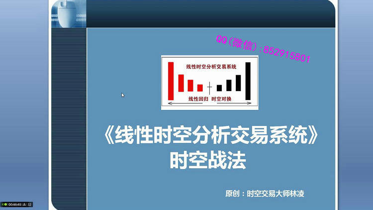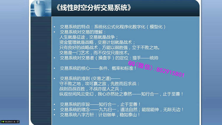 主要内容概括为:线性回归,时空对换,用时间换空间;中心思想概括为:阴阳轮回,大道至简,以不变应万变。交易系统对交易的理解:人生就是征途,交易就是战争;资金管理就是战略,交易计划就是战术;只有良好的战略战术,方能以弱胜强,立于不败之地。交易是一门艺术,而不仅仅只是技术。交易系统对交易者(操盘手)的定位:猎手——统帅交易系统的核心——条件、概率和标准!交易系统的准则 (交易之道)——守不败之地,攻可赢之敌,先胜而后求战:战则百战百胜,不战亦屈人之兵;纵观世间风云变幻,我心亦然处之泰然——知行合一,止于至善!交易系统的宗旨——知行合一,止于至善!交易系统的理念——九九归一,道法自然;能屈能伸,无际无边!交易系统八字方针:计划做单,稳如泰山!视频截图: