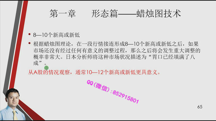 投资的目的是追求幸福生活,赚钱只是副产品而已。课程目录:线图会说话第一集(开篇前言)线图会说话第二集(锤子线和上吊线)线图会说话第三集(吞没形态)线图会说话第四集(乌云盖顶和刺透形态)线图会说话第五集(启明星和黄昏星)线图会说话第六集(流星形态和重要转折形态总结)线图会说话第七集(窗口的运用)线图会说话第八集(突破窗口和一般窗口)线图会说话第九集(上升三法、下降三法、红三兵)线图会说话第十集(数字3、8-10个新高或新低)线图会说话第十一集(支撑压力关键点)线图会说话第十二集(箱体)线图会说话第十三集(压力和支撑的评估)线图会说话第十四集(关键点与成交量的变化)线图会说话第十五集(均线与重要的股价结构)线图会说话第十六课(市场行为包容一切)线图会说话第十七课(三种趋势运动)线图会说话第十八课(牛市和熊市的三个阶段)线图会说话第十九课(趋势的验证)线图会说话第二十课(趋势反转形态)线图会说话第二十一课(均线的运用和三破战法)线图会说话第二十二集(小结和练习)线图会说话第二十三集(练习箱体、趋势线、扇形线)线图会说话第二十四集(练习反转形态)线图会说话第二十五集(结束语、学习过程的重要事项)视频截图: