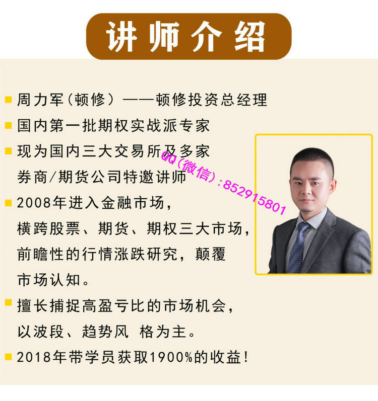 周力军(顿修)一一顿修投资总经理,国内第一批期权实战派专家,现为国内三大交易所及多家券商/期货公司特邀讲师。2008年进入金融市场,横跨股票、期货、期权三大市场,前瞻性的行情涨跌研究,颠覆市场认知。擅长捕捉高盈亏比的市场机会,以波段、趋势风格为主。2018年带学员获取1900%的收益!