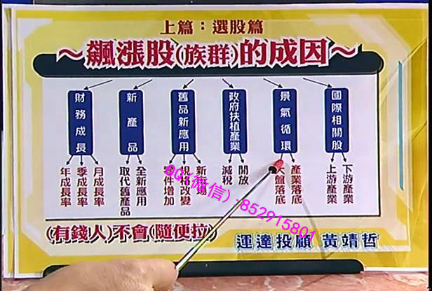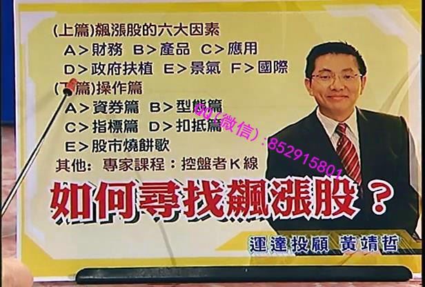 黄靖哲:仟和亿,,爱股轩知名讲师,全球投资策略分析师,著有:《飚股的秘密》、《当冲取材真工夫》、《洗盘骗线--业内不传之秘密》、《如何选择黑马股》等。 培训课程主要讲解如何捕捉飙涨股,共8集视频 视频截图: