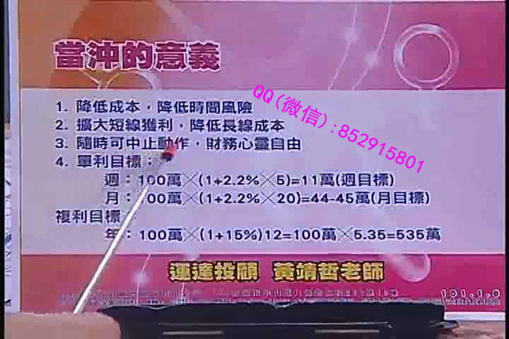 黄靖哲:仟和亿,,爱股轩知名讲师,全球投资策略分析师,著有:《飚股的秘密》、《当冲取材真工夫》、《洗盘骗线--业内不传之秘密》、《如何选择黑马股》等。 培训课程主要讲解水流理论筹码资金,共2DVD内容 视频截图:
