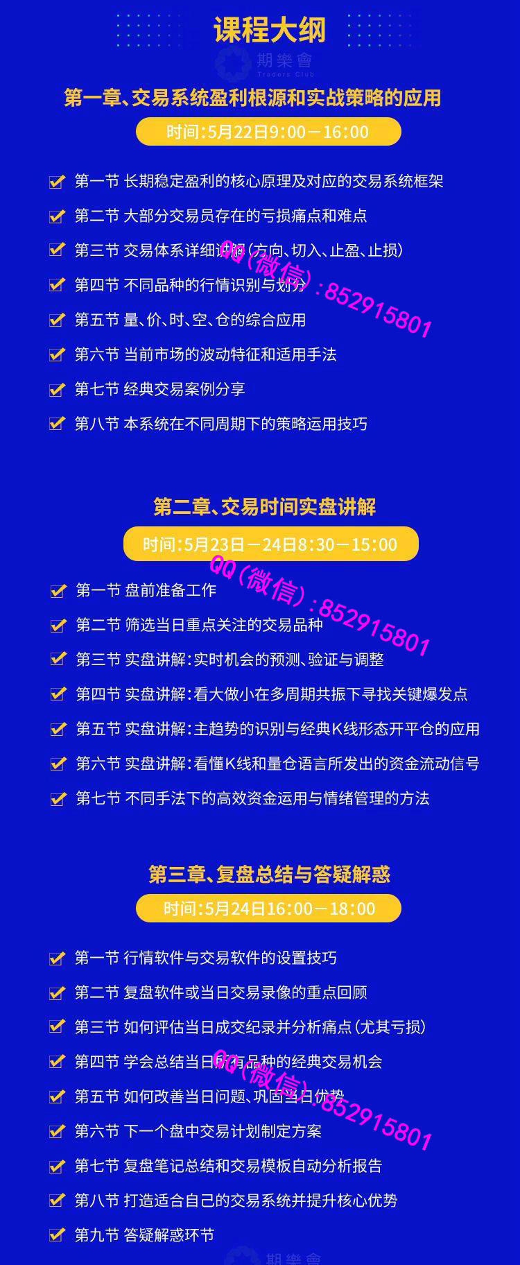 课程大纲:第一章、交易系统盈利根源和实战策略的应用第一节:长期稳定盈利的核心原理及对应的交易系统框架第二节:大部分交易员存在的亏损痛点和难点第三节:交易体系详细讲解(方向、切入、止盈、止损)第四节:不同品种的行情识别与划分第五节:量、价、时、空、仓的综合应用第六节:当前市场的波动特征和适用手法第七节:经典交易案例分享第八节:本系统在不同周期下的策略运用技巧第二章、交易时间实盘讲解第一节:盘前准备工作第二节:筛选当日重点关注的交易品种第三节:实盘讲解:实时机会的预测、验证与调整第四节:实盘讲解:看大做小在多周期共振下寻找关键爆发点第五节:实盘讲解:主趋势的识别与经典K线形态开平仓的应用第六节:实盘讲解:看懂K线和量仓语言所发出的资金流动信号第七节:不同手法下的高效资金运用与情绪管理的方法第三章、复盘总结与答疑解惑第一节:行情软件与交易软件的设置技巧第二节:复盘软件或当日交易录像的重点回顾第三节:如何评估当日成交纪录并分析痛点(尤其亏损)第四节:学会总结当日所有品种的经典交易机会第五节:如何改善当日问题、巩固当日优势第六节:下一个盘中交易计划制定方案第七节:复盘笔记总结和交 易模板自动分析报告第八节:打造适合自己的交易系统并提升核心优势第九节:答疑解惑环节
